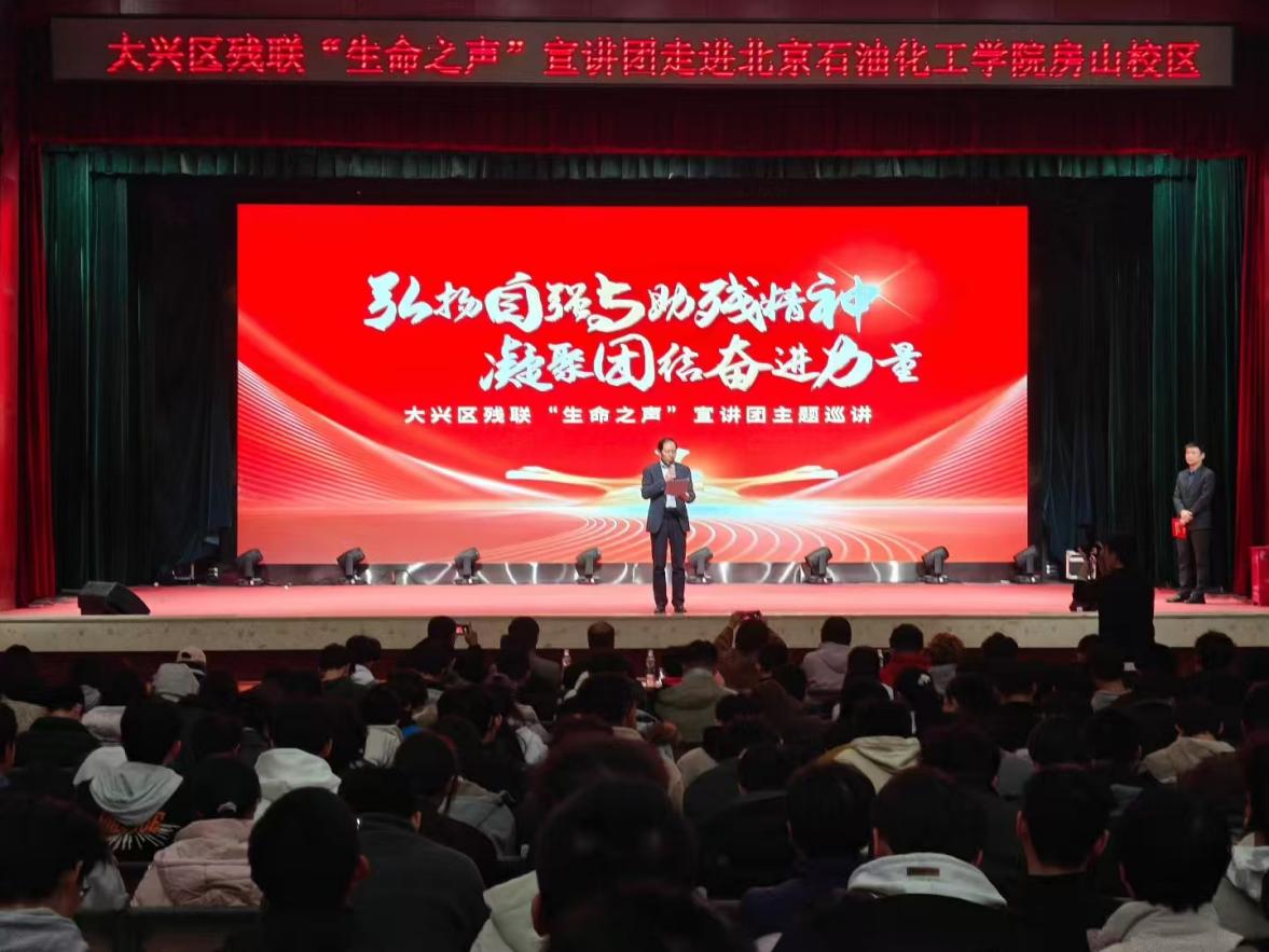 11月11日,由我校馬克思主義學(xué)院參與承辦的大興區(qū)殘聯(lián)“生命之聲”宣講團(tuán)進(jìn)校園活動(dòng)在房山校區(qū)成功舉行。本次活動(dòng)以“弘揚(yáng)自強(qiáng)與助殘精神,凝聚團(tuán)結(jié)奮進(jìn)力量”為主題,通過(guò)宣講團(tuán)成員感人至深的生命故事,為我校師生帶來(lái)了一堂生動(dòng)而深刻的思政課。大興區(qū)殘聯(lián)理事長(zhǎng)牟育著,我校黨委常委、副院長(zhǎng)張泉利,馬克思主義學(xué)院直屬黨支部書(shū)記劉穎、副院長(zhǎng)黃小惠、思政課教師及2025級(jí)新生共千人參加了活動(dòng)。
